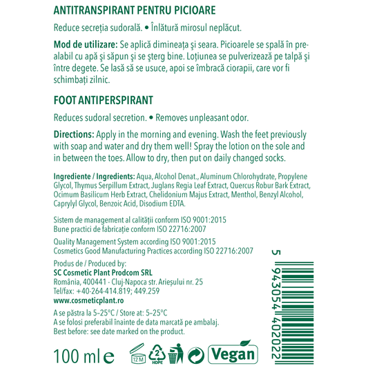 Loțiune antitranspirantă pentru picioare cu busuioc și cimbru, 100 ml Cosmetic Plant