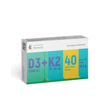 Vitamina D3 2000 UI + Vitamina K2 75 mcg, 40 comprimate filmate, Laboratoarele Remedia