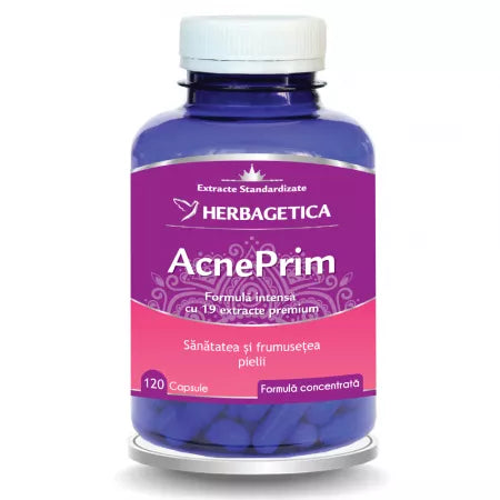 AcnePrim, 120 capsule, Herbagetica Proprietati:- poate contribui la curățarea tenului de acnee, la rducerea secreției de sebum;- poate contribui la refacerea aspectuuil plăcut al tenului;- poate contribui la detoxifierea hepatică, susținerea sistemul imunitar. Mod de utilizare:2-3 capsule pe zi.Ingrediente: Extract...