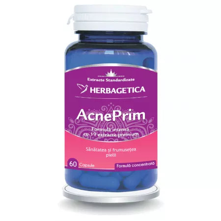 AcnePrim, 60 capsule, Herbagetica Proprietati:- poate contribui la curățarea tenului de acnee, la rducerea secreției de sebum;- poate contribui la refacerea aspectuuil plăcut al tenului;- poate contribui la detoxifierea hepatică, susținerea sistemul imunitar. Mod de utilizare:2-3 capsule pe zi. Ingrediente:...