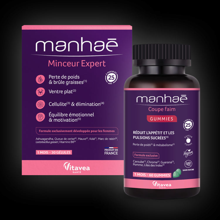 Daca ai cautat combinatia ideala pentru controlul greutatii, e cazul sa te opresti, caci ai gasit-o: Manhae Minceur Expert reduce grasimea abdominala si viscerala (din jurul organelor interne), diminueaza celulita si mentine motivatia, in timp ce Coupa Faim taie pofta de mancare si pofta de dulce. Acum e momentul sa incepi! Natural, fara efecte adverse.