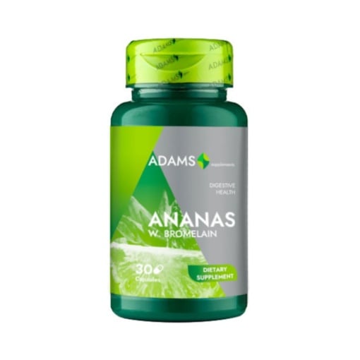 Ananas W. Bromelain Adams Supplements este un supliment alimentar natural pe baza de bromelaina – o enzima proteolitica extrasa din tulpina ananasului. Aceasta enzima este recunoscuta pentru proprietatile sale antiinflamatorii, digestive si imunostimulatoare. Formula este recomandata persoanelor care au dificultati digestive, inflamatii articulare sau doresc sa sprijine procesele naturale de detoxifiere si refacere a organismului dupa efort fizic sau afectiuni inflamatorii.