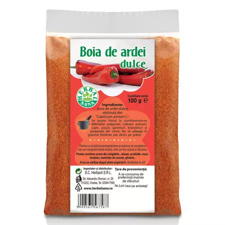 Boia de ardei dulce, 100 g, Herbal Sana Descriere: Boia de ardei dulce, obținută din Capsicum annuum L., este un condiment versatil folosit pentru a intensifica aroma și culoarea preparatelor culinare. Proprietăți: Oferă un gust dulceag și aromat preparatelor. Conține antioxidanți...