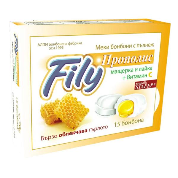Bomboane Umplute cu Extract de Propolis Nealcoolic si Vitamina C - Alpi Fily Propolis, 70 g: are un efect pozitiv asupra mucoasei gurii, gingiilor si gatului si intareste sistemul imunitar. Uleiurile esentiale de cimbru si musetel sunt antiseptice cu proprietati antiinflamatorii, antispastice si antibiotice. Se recomanda maxim cinci bomboane pe zi.