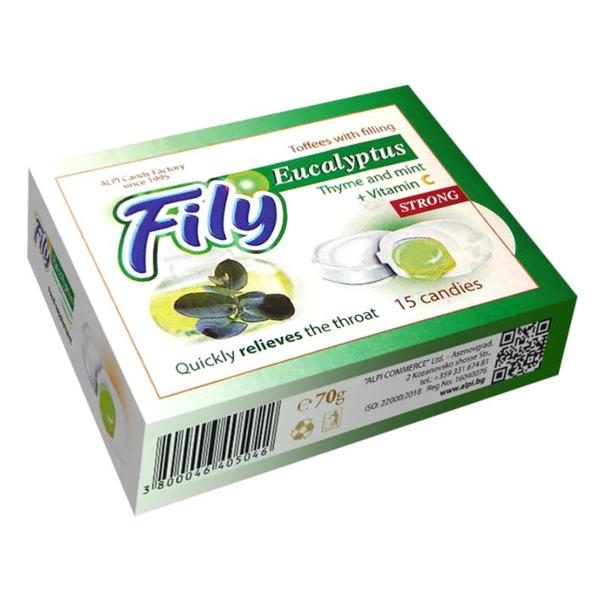 Bomboane Umplute cu Ulei de Eucalipt si Vitamina C - Alpi Fily Eucalyptus, 70 g: au un efect pozitiv asupra mucoasei gurii, gingiilor si gatului si intareste sistemul imunitar. Uleiurile esentiale sunt antiseptice cu proprietati antiinflamatorii, antispastice si antibiotice care ajuta la tractul respirator superior si impotriva durerilor de stomac. Doza zilnica recomandata este de maxim 5 bomboane.