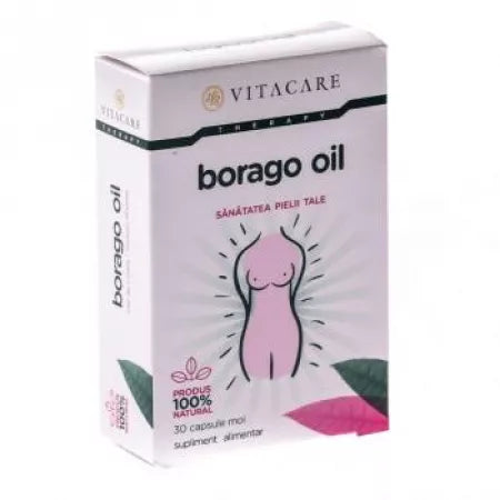 Borago Oil contine o cantitate mare de acizi grasi esentiali de tip GLA si este obtinut prin presarea la rece a semintelor plantei Borago officinalis (Limba mielului). Acizii grasi polinesaturati sunt acizi organici cu rol foarte important in organism, dar care nu pot fi produsi de catre acesta, ci sunt sintetizati numai de plante. Datorita continutului de vitamina E si acizi grasi polinesaturati esentiali de tipul acizilor alfa si gama-linolenic in compozitia extractului, produsul Borago Oil mentine nivelul optim al colesterolului, scade tensiunea arteriala, regleaza greutatea corporala, amelioreaza simptomele premenstruale inclusiv mastalgia, imbunatateste functionarea sistemului imunitar, mentine echilibrul hormonal, si este recomandat si in neuropatia diabetica si dermatitele atopice. Borago Oil impiedica si deshidratarea tesuturilor si incetineste procesul de imbatranire. Rolul acizilor grasi (GLA) este in cresterea normala a vaselor de sange (sporind elasticitatea si micsorand permeabilitatea vaselor), dar si preintampina formarea depunerilor de colesterol in interiorul arterelor. GLA este parte componenta importanta a programului de scadere in greutate. Datele stiintifice sugereaza ca acesti nutrienti favorizeaza metabolismul grasimilor, arzand astfel caloriile. Acizii grasi din compozitia Borago Oil contribuie la asigurarea unui nivel constant de energie si pastreaza senzatia de satietate mai mult timp. Vitaminele liposolubile (A, D, E si K) se absorb doar in „prezenta” acizilor grasi polinesaturati.