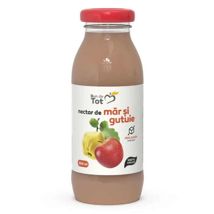 Nectarul natural din piureul de mar si gutuie potoleste setea si alina pofta de dulce, cat ai zice Bun de Tot. Din mere si gutuie proaspat presate, indulcit cu suc de struguri si fara conservanti sau aditivi alimentari, nectarul asigura portia zilnica de vitamine, ca tu sa te bucuri de toata savoarea naturii si de gustul unic al merelor si gutuilor.