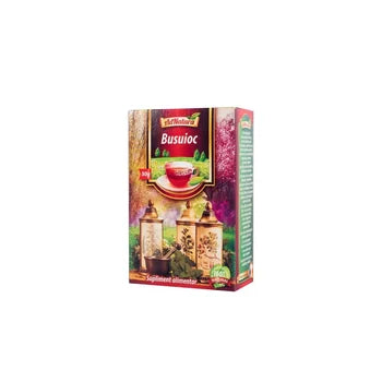Ingrediente: Partile aeriene cu frunze tinere ale plantei de busuioc (Ocimum basilicum).