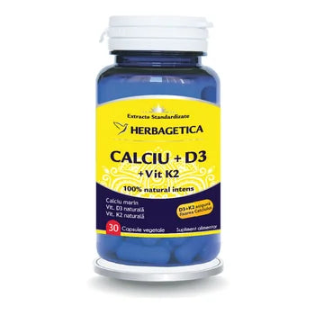 Calciu+D3 cu Vitamina K2 contine vitamine si minerale rezultate din surse 100% naturale, fara ingrediente de sinteza. Sursa naturala de Calciu Organic (Aquamin), obtinut din alge marine calcaroase, si a vitaminelor D3 si K2, garanteaza absorbtia ridicata si eficienta terapeutica a produsului.