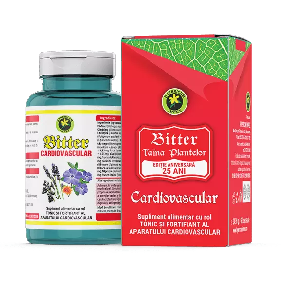 Bitterul „Cardiovascular” este un produs concentrat, obtinut din 30 de plante medicinale cu proprietati fitoterapeutice deosebite. Acesta are o formula originala, produsul fiind preparat, in principal, din plante medicinale existente in flora spontana a Romaniei si fiind atent formulat pentru protejarea si tonifierea sistemului cardiovascular. Grija fata de sanatatea sistemului cardiovascular este cu atat mai necesara cu cat ritmul vietii noastre devine tot mai alert si stresant, iar alimentatia noastra devine tot mai haotica (mese neregulate, asocierea gresita a alimentelor, mancatul in graba si la ore improprii), procesata (devitalizata, lipsita de enzime), plina de toxine, aditivi si cu un profil nutritional dezechilibrat (exces de sare, carbohidrati rafinati: zahar alb, fructoza, glucoza, faina alba si derivatele acesteia, sucuri si de grasimi rele: trans, saturate, oxidate, cu raport omega 6: omega 3 disproportionat).