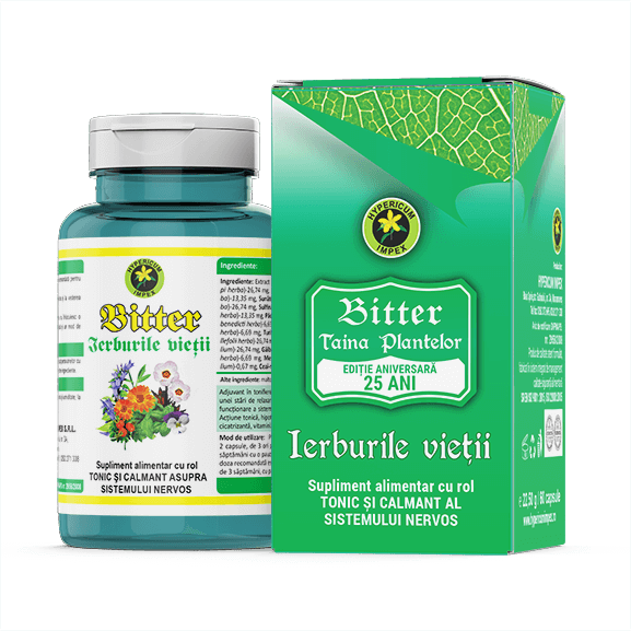 Bitterul „Ierburile vietii” este un produs concentrat, obtinut din 21 de plante medicinale cu proprietati fitoterapeutice deosebite. Acesta are o formula originala, produsul fiind preparat, in principal, din plante medicinale existente in flora spontana a Romaniei si fiind atent formulat pentru protejarea si tonifierea sistemului nervos. Grija fata de sanatatea sistemului nervos este cu atat mai necesara cu cat ritmul vietii noastre devine tot mai alert si stresant, iar alimentatia noastra devine tot mai haotica (mese neregulate, asocierea gresita a alimentelor, mancatul in graba si la ore improprii), procesata (devitalizata, lipsita de enzime), plina de toxine, aditivi si cu un profil nutritional dezechilibrat (exces de sare, carbohidrati rafinati: zahar alb, fructoza, glucoza, faina alba si derivatele acesteia, sucuri; si de grasimi rele: trans, saturate, oxidate, cu raport omega 6: omega 3 disproportionat).