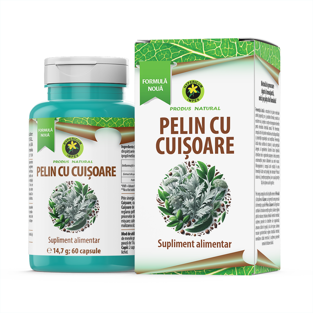 in concluzie, prin sinergia compusilor activi din partile aeriene de Pelin-alb si din pulberea de Cuisoare, cu cei generati in urma procesului de fermentatie, capsulele Pelin cu Cuisoare de la Hypericum contribuie la stimularea secretiilor gastrice si salivare; reglarea poftei de mancare; stimularea eliminarii viermilor intestinali; sustinerea proceselor de detoxifiere ale organismului; atenuarea starilor de greata si rau de miscare; calmarea mucoasei gastrointestinale; reglarea tranzitului intestinal; normalizarea ciclului menstrual si sustinerea proceselor normale de diviziune celulara. Pe scurt, printre virtutile suplimentului se numara actiunea: digestiva, antiparazitara, vermifuga, detoxifianta, stomahica, eupeptica, antiemetica, hepatoprotectoare, emenagoga, antioxidanta, antiinflamatoare, citotoxica, antimalarica, imunomodulatoare, bacteriostatica, antifungica, usor laxativa, diuretica, pro-, pre- si postbiotica.