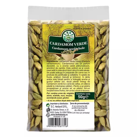 Cardamom verde, 50 g, Herbal Sana Descriere: Cardamom verde întreg, un condiment exotic cu aromă intensă, utilizat atât în preparate dulci, cât și sărate, fiind popular și pentru aromatizarea cafelei. Proprietăți: Aromă caldă și pătrunzătoare, amintind de camfor. Potrivit pentru...