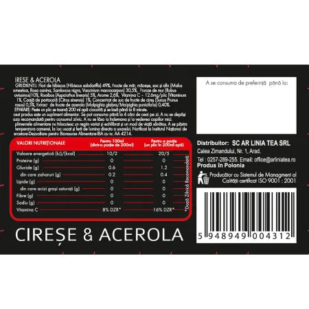 Originara din Caraibe, Acerola este bogata in substante nutritive si are un continut extrem de mare de vitamina C. Delicioasele cirese au o puternica actiune antioxidanta si de crestere a imunitatii. Amestecul deosebit de acerola si cirese face din acest ceai un elixir al vietii, plin de sanatate si savoare.