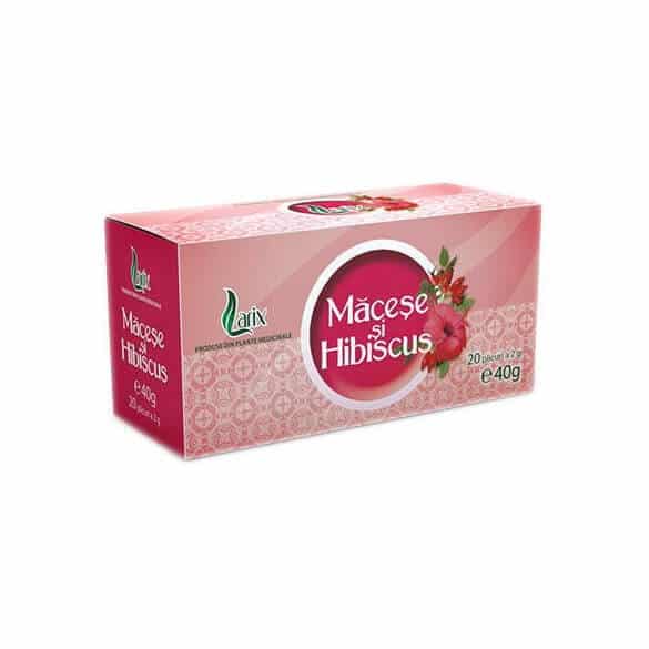 Ceaiul de măceșe cu hibiscus de la Larix este o infuzie naturală destinată susținerii sănătății generale, având efecte benefice asupra sistemului imunitar și cardiovascular. Combinând fructele de măceșe, bogate în vitamina C, cu florile de hibiscus, acest ceai oferă o băutură plăcută și reconfortantă.