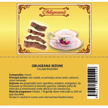 Compozitie: obligeana rizomi (CALAMI RHIZOMA). Principii active: ulei volatil,un principiu amar,tanin,zaharuri,saruri minerale Actiune : are proprietati tonic-aperitive,sedative,analgezice.Se foloseste ca stimulent al secretiei gastrice,mareste pofta de mancare si amelioreaza unele afectiuni ale stomacului. Mod de preparare: infuzie, 1 lingurita rizom maruntit cu 2oo ml apa ...