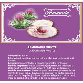 Compozitie: fructe de armurariu. Principii active: silimarina,clorhidrat de betaina,aminoacizi,acid fumaric. Actiune: hepatoprotector si hepatoregenerator,tonic amar. Mod de preparare: infuzie dintr-o lingurita de fructe macinate la 200ml apa clocotita.Se lasa acoperit 10-15 min.,se strecoara. Mod de administrare: doua cani pe zi,prima cu o jumatate de ora...