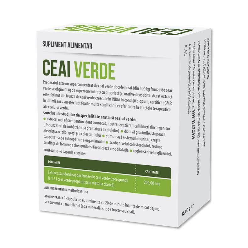 | Ingrediente | O capsula contine: Extract standardizat din frunze de ceai verde (Camellia sinensis) (corespunde la 1,5 l ceai verde preparat prin metoda clasica) 200,00 mg |