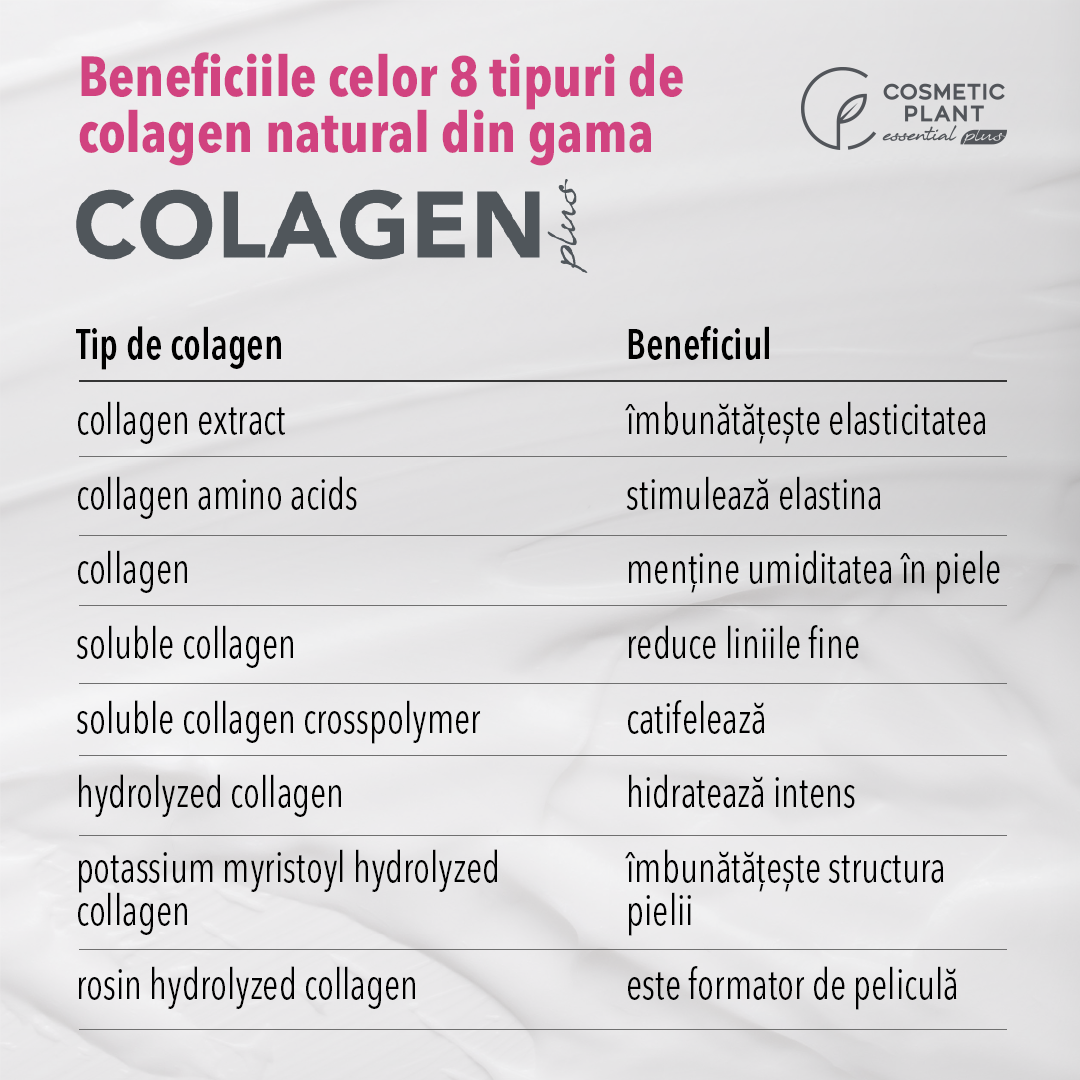 Complexul de Colagen contine 8 tipuri de colagen natural, cu greutate moleculara diferita care patrund prin epiderma pana la stratul mai profund al pielii.