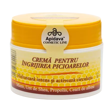 Crema pentru ingrijirea picioarelor, 50 ml, Apidava Miere, unt de shea, propolis, ceara de albine.Fara parabeni.Proprietati:- contribuie la activarea circulatiei periferice si inlaturarea senzatiei de picioare obosite;- untul de shea este folosit in tratarea pielii uscate, fiind un bun cicatrizant...