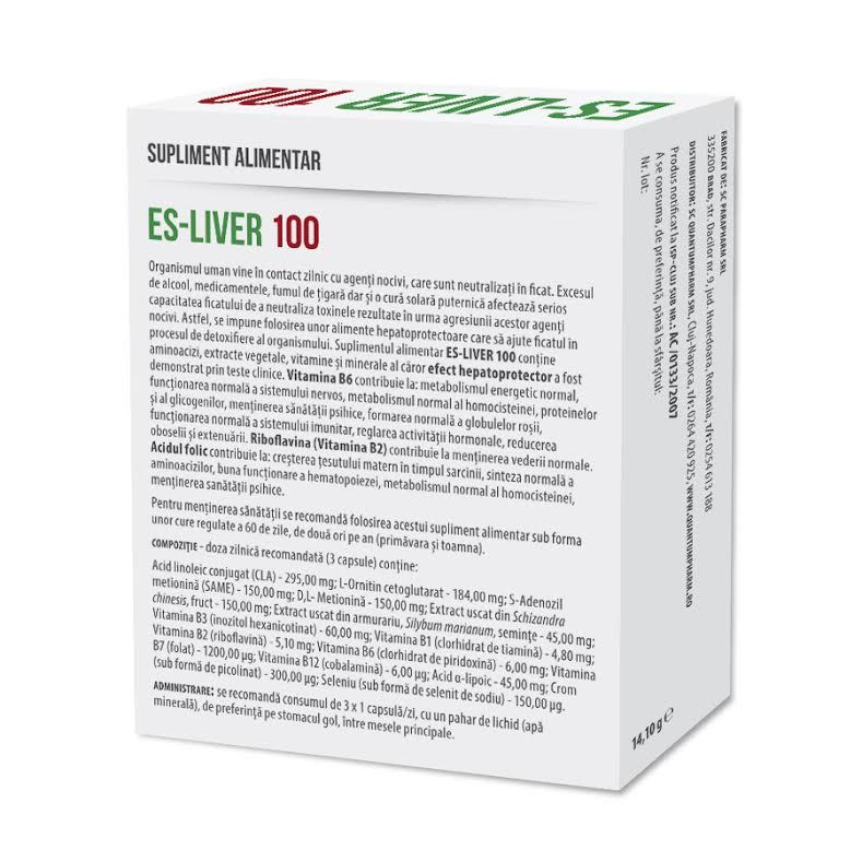 Organismul uman vine permanent in contact cu agenti nocivi care sunt neutralizati in ficat. Excesul de alcool, medicamentele, fumul de tigara sau chiar o cura solara puternica afecteaza serios capacitatea ficatului de a neutraliza aceste toxine. Efectele cumulate ale acestor agresiuni complexe pot conduce, in timp, la afectiuni hepatice grave: incarcare cu grasimi a ficatului si ciroza. Es-Liver 100 este un supliment hepatoprotector si hepatoregenerator foarte eficient. In compozitia lui intra extracte vegetale, vitamine, oligominerale esentiale si aminoacizi sub forma superactiva, de exemplu S-Adenozil metionina (SAME), despre care s-a demonstrat prin teste clinice efectuate in SUA ca este singurul compus cunoscut care are capacitatea de a regenera ficatul cirozat. Acidul linoleic conjugat (CLA) este componenta principala a membranei celulare hepatice si ajuta la refacerea acesteia. Principala diferenta intre Es-Liver 100 si alte suplimente hepatoactive este ca acest produs pe langa efectul protector are si efect HEPATOREGENERATOR, astfel: elimina grasimile acumulate in ficat activeaza celula hepatica regenereaza ficatul cirozat