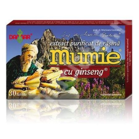 Rasina Mumie este cunoscuta si utilizata de aproximativ 3000 de ani, in peste 50 de domenii. Aceasta rasina se gaseste in Podisul Tibet si in muntii Pamir, la inaltimi de peste 2000-5000 de metri. Se prezinta sub o forma vascoasa avand culoare brun inchis si un gust amar, caracteristic. In compozitia sa intra un intreg complex de substante organice si minerale (25 pana la 40): produse de descompunere a compusilor polimoleculari (acizi zoomelanici, acizi humici, acid benzoic, oxalic), aminoacizi (fenilalanina, alanina, arginina, tirozina, lizina, serina, valina, metionina, glicina, acid aspartic, acid glutamic), terpenoide, steroizi vegetali, vitamine C, E, din grupa B si P, fragmente de molecule polifenolice, macroelemente si microelemente: calciu, magneziu, sodiu, potasiu etc.
