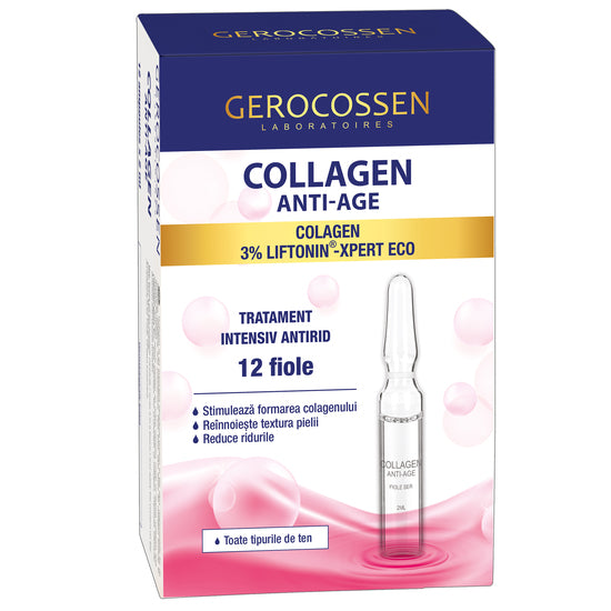 Fiole tratament antirid intensiv Collagen Anti-Age, 12x2 ml, Gerocossen Fiolele cu ser Collagen Anti-Age contin un complex activ format din colagen marin si Liftonin Xpert Eco cu rol de stimulare a formarii colagenului, de imbunatatire a elasticitatii si fermitatii pielii. Prin utilizare timp de cel...