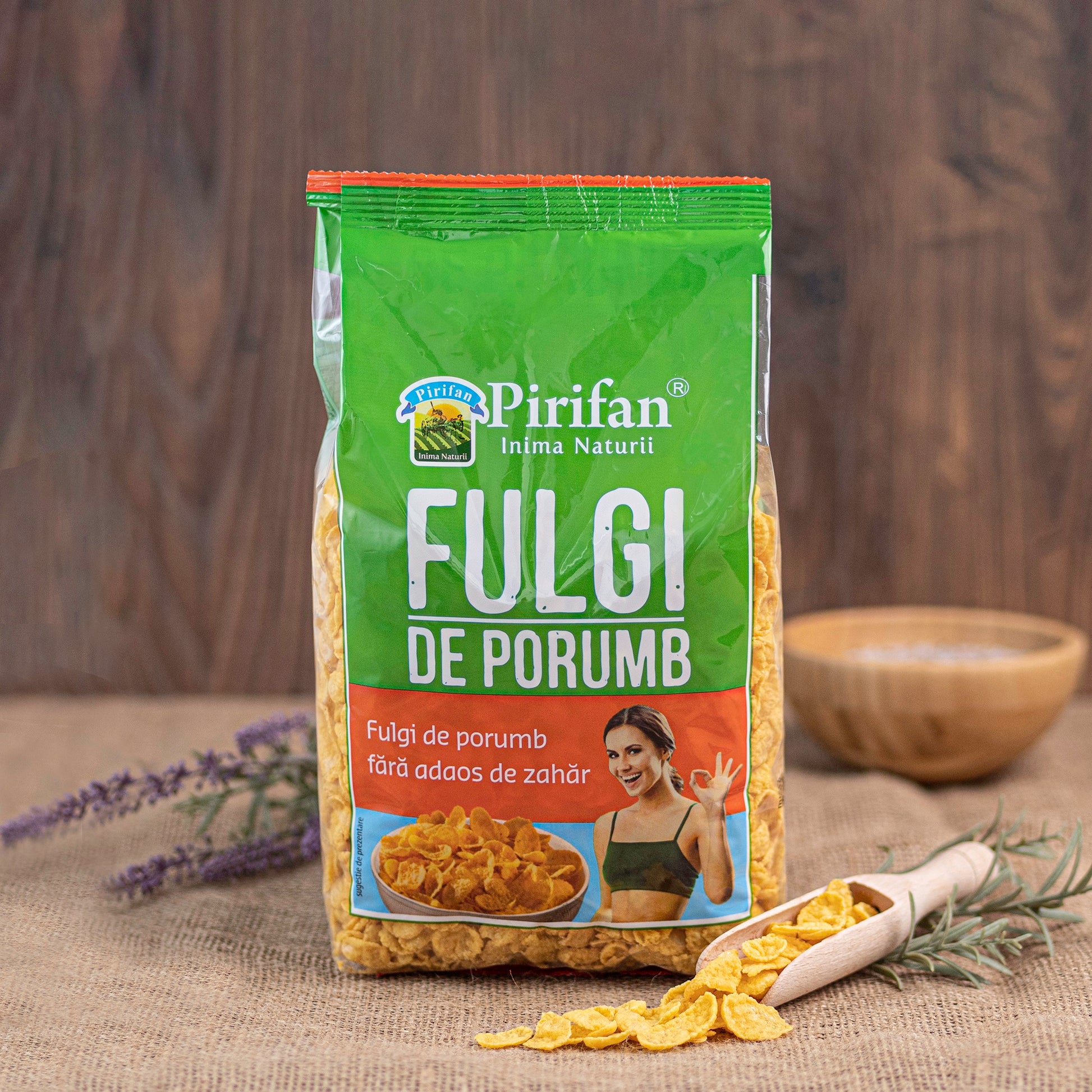 Beneficii Aveţi grija de organismul dumneavoastra si incepeţi-va ziua in forta, cu o portie de fulgi de porumb fara zahar de la Pirifan. Gratie continutului ridicat de acid foloic, fulgii de porumb sunt utili in prevenirea malformatiilor congenitale si a cancerului de colon.