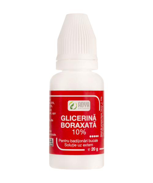 Glicerina boraxata Adya Green Pharma prezinta proprietati antiseptice si dezinfectante locale, antimicotice si usor anestezice, fiind remediul potrivit in cazul afectiunilor mucoasei bucale.