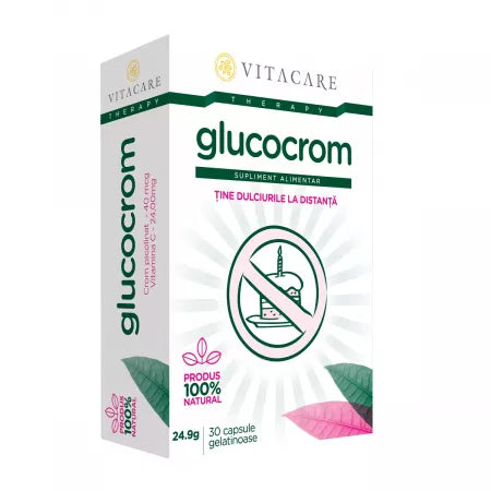 Cromul este un element esential pentru buna functionare a organismului si are o importanta vitala pentru sanatate. Cromul in forma picolinat, cea mai activa forma, este recunoscut pentru eficienta sa in reglarea si buna desfasurare a metabolismului glucidelor. in acest sens, cromul picolinat potenteaza activitatea insulinei, astfel actioneaza indirect asupra concentratiei de glucoza in sange. Acest mecanism este benefic si poate ajuta mai ales diabeticilor, dar si persoanelor cu un metabolism al glucidelor (carbohidratilor) alterat. Cantitatea de crom din organism scade proportional cu inaintarea in varsta, precum si in urma activitatii fizice intense. Lipsa cromului creste sensibilitatea la glucide si poate duce la cresterea in greutate sau la diabet zaharat. Insulina este unul dintre cei mai importanti hormoni cu rol in dezvoltarea musculaturii, stabilizarea greutatii corporale si in functionarea adecvata a aparatului cardio-vascular. in lipsa cromului, insulina nu e capabila sa participe la metabolismul glucidic. Cromul este deci util si diabeticilor, in special in fazele incipiente ale bolii, dar nu poate substitui insulina sau antidiabeticele orale. Deoarece participa la metabolismul glucozei, intensifica efectul insulinei, reglementeaza distributia interna a energiei, stabilizeaza concentratia glucozei sangvine, faciliteaza asimilarea aminoacizilor, accelereaza metabolismul proteinelor si intensifica majoritatea proceselor metabolice, cromul sporeste capacitatea de munca si de auto-regenerare a organismului. De asemenea, produce cresterea nivelului de colesterol sangvin si a susceptibilitatii pentru bolile cardiovasculare. in cazul sportivilor, lipsa cromului reduce randamentul fizic si impiedica dezvoltarea musculaturii. Dupa 20 de ani de cercetari se poate afirma ca Cromul Picolinat este mai eficient decat alte forme de crom in privinta reglarii nivelului de zahar si de insulina in cazul diabetului de Tip 2. Cromul este de asemenea util si in curele de slabire, Vitamina C este un nutrient esential vietii, solubil in apa, implicat in productia de glucocorticosteroizi si de anumiti neurotransmitatori (substante care permit transmisia influxului nervos), in metabolismul glucozei, al colagenului, al acidului folic si al anumitor aminoacizi, in neutralizarea radicalilor liberi si a nitrozaminelor, in reactii imunologice, care faciliteaza absorbtia fierului la nivelul tubului digestiv. Vitamina C administrata in doze mici alaturi de crom creste substantial absorbtia cromului picolinat si impreuna imbunatatesc actiunea insulinei. Glucocrom se recomanda in special persoanelor cu un metabolism al glucidelor dezechilibrat (diabeticilor) deoarece ajuta la scaderea glicemiei postprandiale. Este eficient in cazul persoanelor care manifesta un apetit exagerat pentru dulciuri, intrucat cromul intervine in metabolizarea lor si nu in ultimul rand ajuta la mentinerea greutatii corporale.