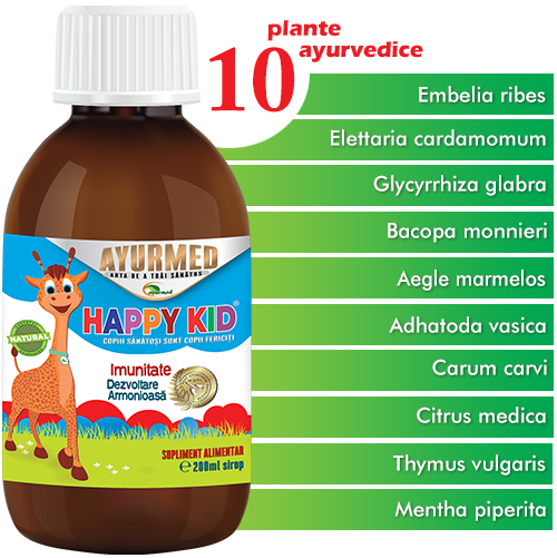 Cresterea si starea de sanatate a copilului sau este o preocupare permanenta a oricarui parinte. Copiii au nevoie de mai mult suport pentru a se mentine sanatosi, au nevoie de mai mult decat o dieta echilibrata si exercitii fizice regulate. Suplimentul alimentar HAPPY KID sirop este un produs natural din plante medicinale ayurvedice, cunoscute pentru proprietatile lor tonice, care sustin cresterea armonioasa si sanatoasa a copilului. Combinatia dintre Elettaria cardamomum, Glycyrrhiza glabra, Aegle marmelos, Carum carvi si Bacopa monnieri, alaturi de celelalte plante din produsul HAPPY KID sirop au efecte sinergice contribuind la pastrarea unui apetit sanatos, la asimilarea corecta a substantelor nutritive din hrana, la buna functionare a sistemului digestiv si hepatobiliar si la eliminarea naturala a toxinelor. Complexul de fitonutrienti din HAPPY KID sirop mentin sanatatea si functionarea normala a cailor respiratorii superioare, ajuta la eliminarea apei din organism si a radicalilor liberi, contribuind astfel la cresterea capacitatii de autoaparare a organismului si de adaptare la conditiile de mediu.