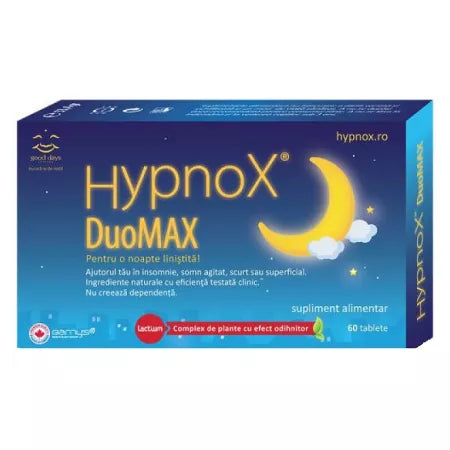 Poate fi utilizat ocazional sau pe termen lung, fără a crea dependentă. Mod de administrare: Se ia intern 1 comprimat cu 30 de minute înainte de culcare. Utilizat conform prospectului, Hypnox® DuoMAX nu prezintă reacții adverse. Este permis diabeticilor. Contraindicații:...