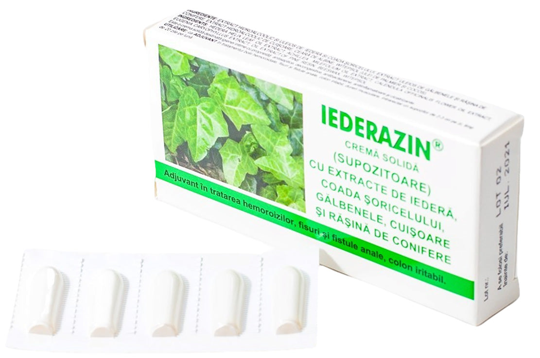 WITEPSOL – folosit ca baza de supozitoare, se obtine prin hidrogenarea catalitica a uleiului de cocos (80%) si palmier (20%). ACTIUNE ale supozitoarelor IEDERAZIN: antiseptica, antiinflamatoare, antimicrobiana, astringenta, anestezica ( de suprimare a durerii), cicatrizanta, reconfortanta, de refacere a tesuturilor, curativa in afectiuni cutanate, calmanta, tonica, antiiritativa. UTILIZARE supozitoare IEDERAZIN: in tratamentul bolii hemoroidale, fisuri si fistule anale, colon iritabil, ulceratii, rani, previne formarea cheagurilor de sange si imbatranirea prematura, fortifica sistemul imunitar, previne formarea nodulilor si polipilor pe colon, in afectiuni genitale (fibrom, chisturi uterine), afectiuni ale prostatei (previne imbatranirea muschilor prostatei).
