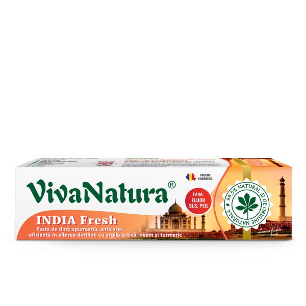 India Fresh este o pasta de dinti naturala, ideala pentru igiena orala zilnica si echilibrarea florei bacteriene la nivelul gurii. Formula sa unica, cu 99,5% ingrediente naturale, este inspirata din traditia ayurvedica indiana si conceputa pentru a ingriji delicat si eficient cavitatea bucala.