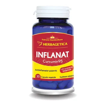 Inflanat+ Curcumin95 are o formula imbogatita cu 10 extracte naturale care garanteaza un efect puternic antiinflamatoar si antioxidant. Asocierea de Curcumin95 C3 complex cu extractele de boswellia serrata, acerola, salvie, cimbru si cuisoare combate eficient inflamatia din corp, inhiba activitatea anumitor enzime si activeaza raspunsul inflamator in corp.