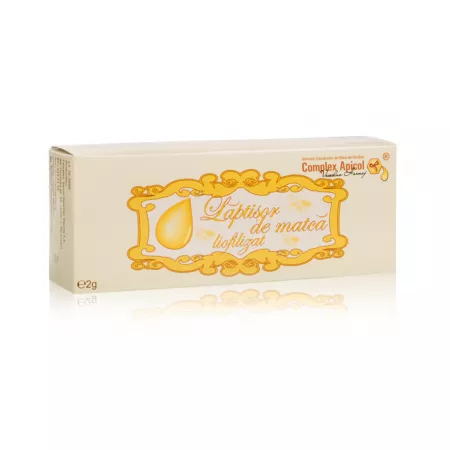 Cutia contine 2g de laptisor de matca liofilizat necesar pentru o cura de 10 zile cu laptisor de matca impartit in 10 fiole de laptisor de matca si 10 fiole de solvent. Liofilizarea laptisorului de matca se realizeaza dupa metode stiintifice care vor asigura un preparat stabilizat, preparat in conditii optime pentru a pastra intacte toate proprietatile laptisorului de matca.