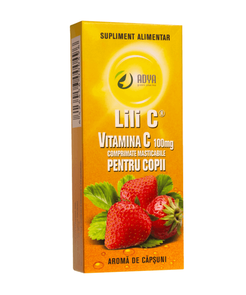 Lili C pentru copii cu aroma de capsuni 100mg este un supliment alimentar adaptat necesarului zilnic al copiilor, intr-o forma atractiva pentru cei mici (cu gust de capsuni).