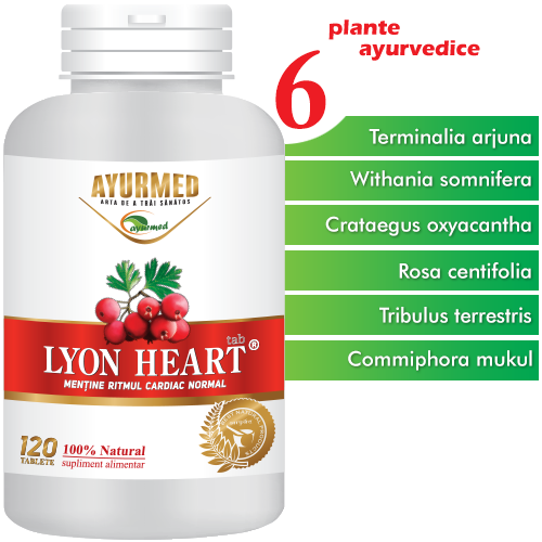 Bolile cardiovasculare constituie una din principalele cauze de deces pe plan mondial. in prezent asistam la un declin usor al incidentei bolilor cardiovasculare si aceasta in special datorita masurilor preventive si tratamentelor eficiente. Conform Ayurveda, corpul este guvernat de trei Dosha numite Vata, Pitta si Kapha. Iar buna functionare a inimii este conditionata de trei subdiviziuni ale acestor Dosha cunoscute sub numele de Vyana Vayu (care asigura fluxul normal al sangelui), Sadhaka Pitta (responsabila de echilibrul emotional) si Avalambaka Kapha (care confera sentimentul de securitate). Hridaya (inima) reprezinta sursa vietii (Ayus) deoarece nicio fiinta nu poate trai daca ea se opreste. inteleptii ayurvedici atribuie inimii rolul de sediu al constiintei. De altfel, in conformitate cu Ayurveda, motivele principale care determina aparitia afectiunilor cardiace (Hrid-roga) sunt dieta, anxietatea si stilul de viata. Suplimentul alimentar LYON HEART contine plante medicinale ayurvedice care contribuie la mentinerea sanatatii si a functionarii normale a inimii prin cresterea puterii de contractie si a randamentului muschiului cardiac, normalizarea ritmului batailor inimii si reducerea spasmelor coronariene. Fitonutrientii din LYON HEART contribuie la sustinerea unei circulatii sanguine optime prin mentinerea elasticitatii si structurii vaselor de sange si a tensiunii arteriale in limite normale. Prin cresterea metabolismului lipidelor cu eliberare de energie si mentinerea nivelul normal al lipidelor din sange este sustinuta rezistenta si sanatatea vaselor sistemului circulator.