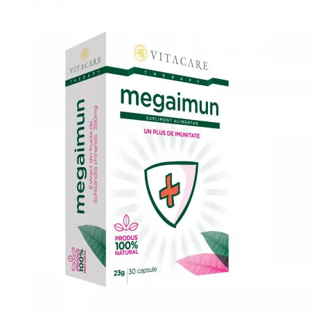 Megaimun este un produs ce are la baza un extract din fructe de Schisandra chinensis (fructul cu cinci gusturi), planta ce este este folosita pentru o gama larga de afectiuni: antiinflamator – blocheaza producerea metabolitilor, previne distrugerea tisulara fara a interfera cu capacitatea organismului de a se apara impotriva infectiilor; protector hepatic exceptional: antimutagenic, antitoxic, anticancerigen; protejeaza membrana si previne necrozarea hepatocitelor, mentine nivelul de glutation hepatic, stimuleaza sinteza glicogenului si a proteinelor, reduce nivelul transaminazelor serice, amelioreaza metabolismul acizilor biliari in ciroza, carcinom hepatic, icter, hepatite virale si alcoolice, reface tesutul hepatic dupa hepatectomie, adaptogen: stimuleaza selectiv functiile organismului ajutandu-l sa se adapteze fizic, psihic, imunitar, creste capacitatea organismului de a raspunde rapid la stres fara expunerea indelungata la efectele negative ale cortizolului, reduce efectele cardio si hepatotoxice ale chimioterapiei, reduce riscul aparitiei cancerului de piele secundar expunerii la toxice carcinogene, antioxidant, reda frumusetea si stralucirea pielii in eczeme, urticarii, candidoze, alergii si alte afectiuni dermatologice, imbunatateste respiratia in congestie pulmonara, astm si emfizem.
