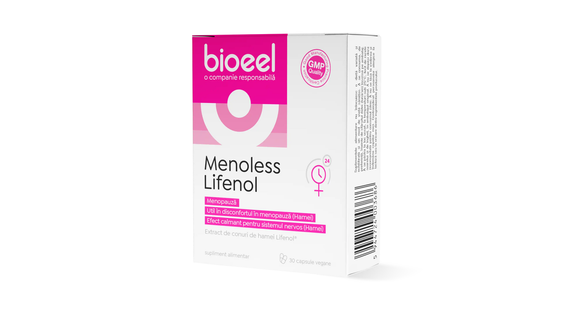 Produsul contine extract din conuri feminine de hamei, standardizat in 8-prenilarigenina, pentru care studiile clinice arata ca prezinta activitate estrogenica ridicata, fiind cel mai active fitoestrigen. 85mg Lifenol® pe zi (1 capsula Menoless Lifenol), care ajuta la mentinerea calmului si a confortului, sprijina femeile in gestionarea simptomelor specifice menopauzei, precum bufeurile, transpiratia, agitatia si iritabilitatea. Are efect calmant pentru sistemul nervos si este util in cazul problemelor cu somnul; calmeaza sistemul nervos central excitat.