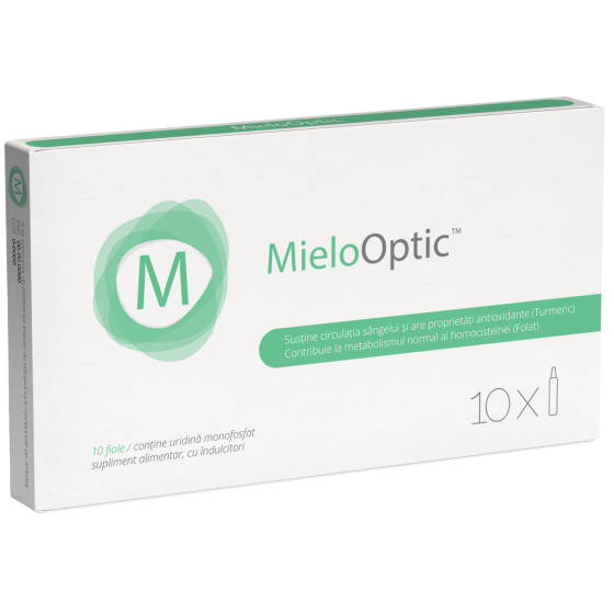 Mielooptic este un supliment alimentar cu o formula avansata, care contine uridina monofosfat, vitamine din complexul B (Vitamina B1, B3, B6, B12 si acid folic) si extracte de Turmeric si Craite.