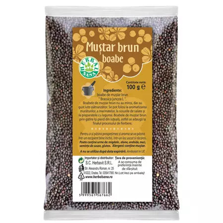 Mustar brun boabe, 100 g, Herbal Sana Descriere: Boabele de muștar brun sunt un ingredient aromat, utilizat pentru murături, marinade și sosuri, având un gust intens și pătrunzător. Proprietăți: Nu au miros, dar au un gust puternic, iute și pătrunzător....
