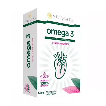 Produsul Omega 3 reprezinta o sursa naturala de lipide marine atent selectionate avand un continut bogat de acizi grasi polinesaturati in special acid eicosapentanoic (EPA) si acid docosahexanoic (DHA). Uleiul de somon, continut de produsul Omega 3, este un ulei de peste de mare adancime, cu efecte benefice asupra sanatatii, ce completeaza dieta zilnica a unui organism sanatos. Omega 3 este eficienta in reducerea nivelului grasimilor din corp, regleaza nivelul colesterolului si imbunatateste functiile vaselor sangvine. Acizii grasi esentiali Omega 3, regleaza nivelul zaharului din sange, ceea ce duce la reducerea poftei de mancare. Pe termen lung, Omega 3 scade riscul de a face diabet si de a te ingrasa peste masura. Este demonstrat ca Omega 3 ajuta in curele de slabire, deoarece acizii grasi Omega 3 cresc rata cu care metabolismul arde caloriile. Straturile in exces sunt exterminate cel mai eficient atunci cand programul obligatoriu de exercitii fizice – care controleaza glicemia si colesterolul din sange – este asociat cu consumul uleiului de peste bogat in Omega 3 – ulei de somon. Produsul Omega 3 are efecte benefice atat asupra sistemului cardiovascular, cat si asupra sistemului nervos central. Beneficiile acestui produs se refera la normalizarea tensiunii arteriale, scaderea colesterolului si a trigliceridelor, diminuarea aritmiilor cardiace si mentinerea consistentei normale a sangelui grabie efectelor sale hipocolesterolemiante, ameliorarea inflamatiei varicoase a venelor datorita proprietatilor sale antiinflamatoare. De asemenea, ajuta in cazul durerilor articulare si articulatiilor rigide, impiedicand aparitia aterosclerozei. Carenta acestor acizi esentiali se manifesta sub forma de eriteme cutanate, eczeme, intarzieri de crestere, hipertensiune arteriala, nervozitate si se datoreaza unui deficit alimentar. in conditii de insuficienta hepatica, stres, senescenta, menopauza, alcoolism, fumat creste necesarul de acizi grasi esentiali.