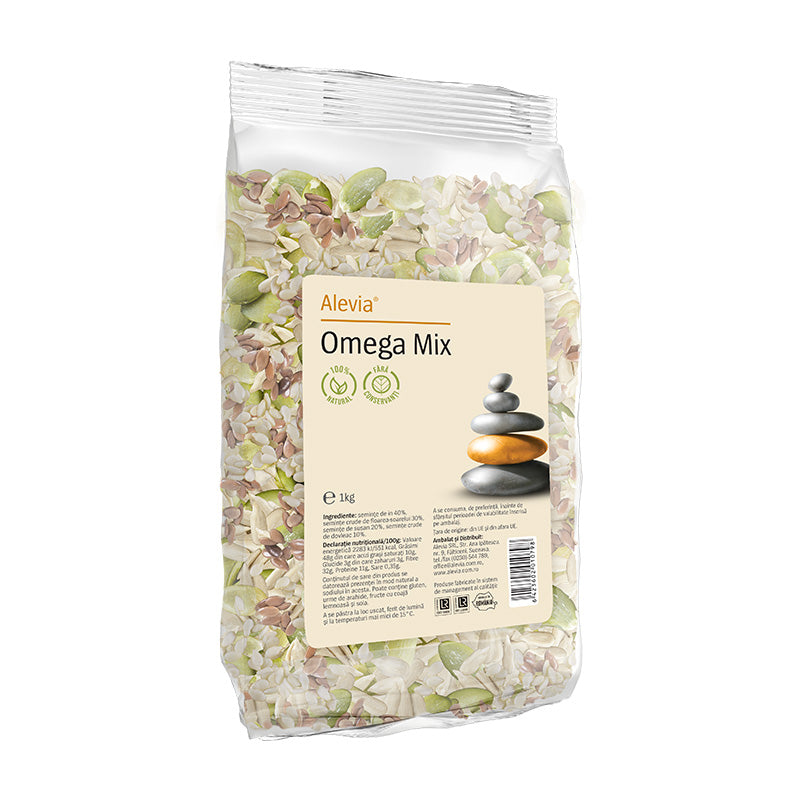 Omega Mix este un amestec echilibrat de seminte de in (40%), seminte crude de floarea-soarelui (30%), seminte de susan (20%) si seminte crude de dovleac (10%), oferind o combinatie unica de grasimi sanatoase, proteine, vitamine si minerale esentiale.