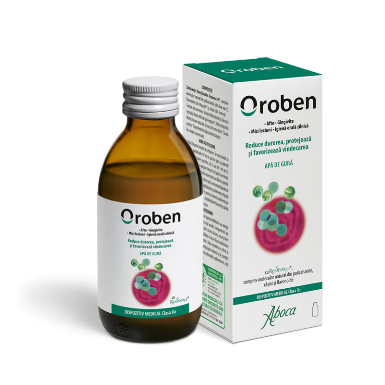 Oroben Apa de gura este un produs care, prin formarea unei pelicule protectoare, reduce durerea si favorizeaza vindecarea aftelor, a stomatitelor aftoase recurente, a gingivitelor inflamate si a micilor leziuni de la nivelul gurii, cauzate, de exemplu, de tratamente dentare sau de utilizarea aparatelor ortodontice si a protezelor dentare.