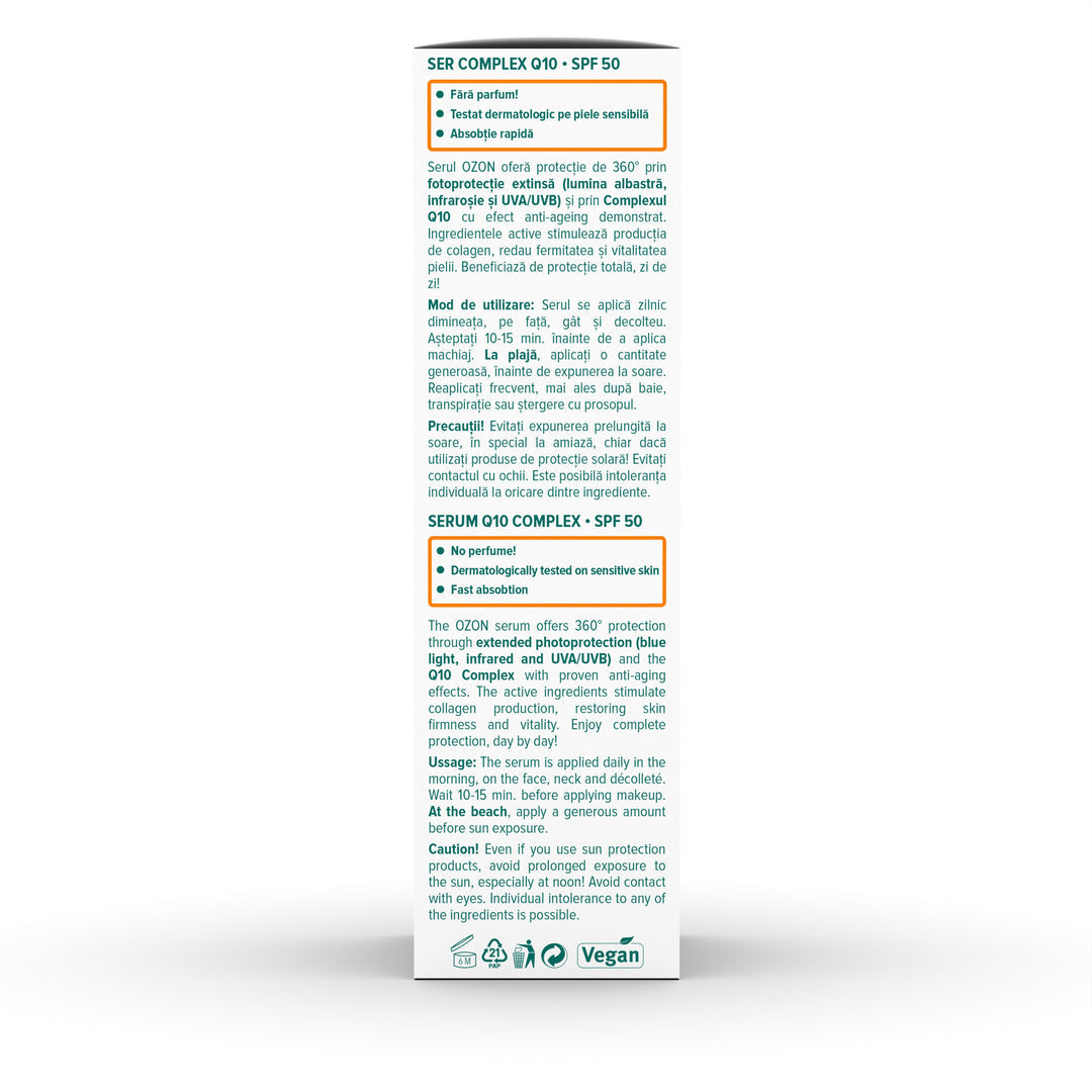 Serul OZON ofera protectie de 360° prin fotoprotectie extinsa (lumina albastra, infrarosie si UVA/UVB) si prin Complexul Q10 cu efect anti-ageing demonstrat. Ingredientele active stimuleaza productia de colagen, redau fermitatea si vitalitatea pielii. Beneficiaza de protectie totala, zi de zi!