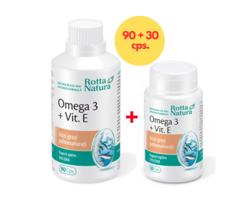 Rotta Natura uleiul de peste 1000 mg. (cu Omega-3 300 mg. + Vitamina E) contine o cantitate mare de ulei de peste de calitate si concentratie superioare ce contribuie la refacerea echilibrului de acizi grasi Omega-3 din organism.