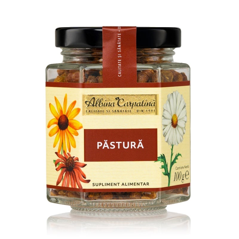 Pastura este un produs apicol deosebit, rezultat din fermentarea polenului crud timp de trei luni in stup, in conditii naturale. Albinele aduc polenul in stup si il depoziteaza in celulele fagurelui, unde este amestecat cu putina miere cruda si diverse enzime. Celulele sunt apoi sigilate cu o pelicula de ceara, initiind procesul de fermentatie lactica, care transforma ingredientele din polen in forme mai accesibile metabolismului uman. Datorita acestui proces, pastura este mult mai valoroasa decat polenul crud, oferind o absorbtie si eficacitate sporita a nutrientilor.