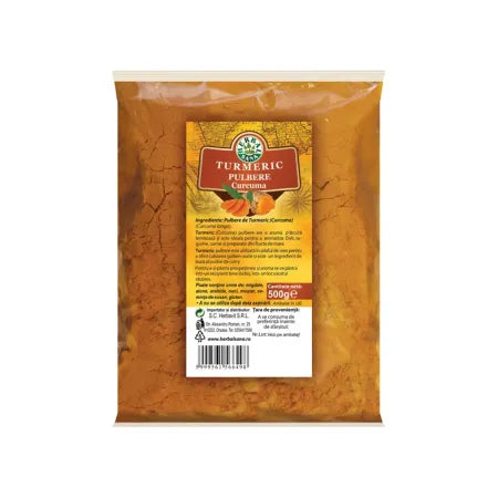 Pulbere de Turmeric, 500 g, Herbavit Proprietati: - aroma placuta si usor lemnoasa, ideala pentru aromatizarea carnurilor si legumelor;- turmericul are proprietati antioxidante si antiinflamatorii, contribuind la mentinerea sanatatii;- poate fi utilizat si ca ingredient de baza al pudrei de...