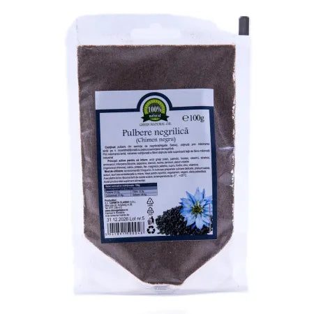 Pulbere din seminte de negrilica, obtinuta prin macinarea lenta pe o moara traditionala cu pietre a semintelor de negrilica. Prin macinarea lenta, valoarea nutritionala a fainii obtinute este superioara fata de faina macinata industrial.